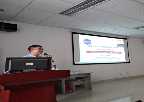 为增进学院19级特教专业新生对特殊教育的专业认识,拓宽教师的教学科研视野,学院邀请南京特殊教育师范学院张伟锋博士于9月24,在特教楼302会议室,为我院师生做了《镜鉴与启示:两岸特殊教育之比较——基于台湾访学的经历》的报告,并与我院师生进行了交流。我院19级特教专业新生及部分教师参加了此次报告,讲座由特教系主任宿淑华老师主持。