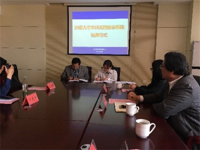挂牌仪式由泰安市特殊教育中心副校长褚文静主持,首先对我校一行人的的到来表示了热烈的欢迎,并对接下来的合作满怀期许。随后,泰安市特殊教育中心校长高理敬介绍了学校“美丽特教”的治学思想,并表示本次本科实践教学基地的落成,是两校长久以来良好合作的硕果。我院党委副书记、副院长季竹君深受高校长满怀特教情怀讲话的触动,他表示在与泰安市特殊教育中心的继续合作中感受到了更多的责任与使命感,对特教中心长久以来的支持表示感谢。希望借助济南大学已有的资源与平台,发挥学科优势与特色,集两校之力更好地为特殊儿童发展服务、为本科人才培养提供基础。之后,双方领导共同签署本科实践教学基地合作协议,并为基地落成揭牌,由此标志着泰安市特殊教育中心正式成为我校本科实践教学基地。