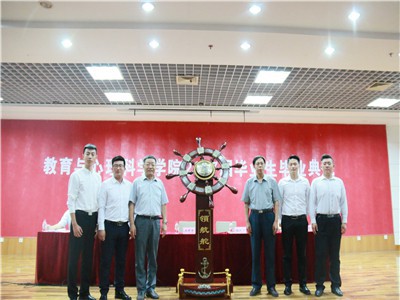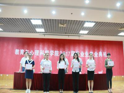 毕业典礼在庄严肃穆的国歌中拉开了帷幕。学院副院长王本法宣读2017届优秀毕业生表彰决定,并为学院优秀学生代表颁发了优秀证书。2017届全体教心学子经过几年的艰辛努力、刻苦学习,用智慧和汗水谱写了大学生活光辉绚丽的篇章,圆满完成了学业,即将开启新的人生征程。在踏上新的征途之前,毕业生们表达了对学院深深的爱意:“领航舵”寄予学院,希望教育与心理科学学院蒸蒸日上,一帆风顺,成就雄基伟业。学院也向2017届毕业生赠送纪念礼物,希望他们永远记得教心这个港湾,无论风雨一定要常回家看看。