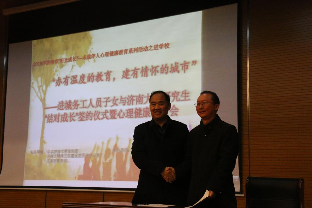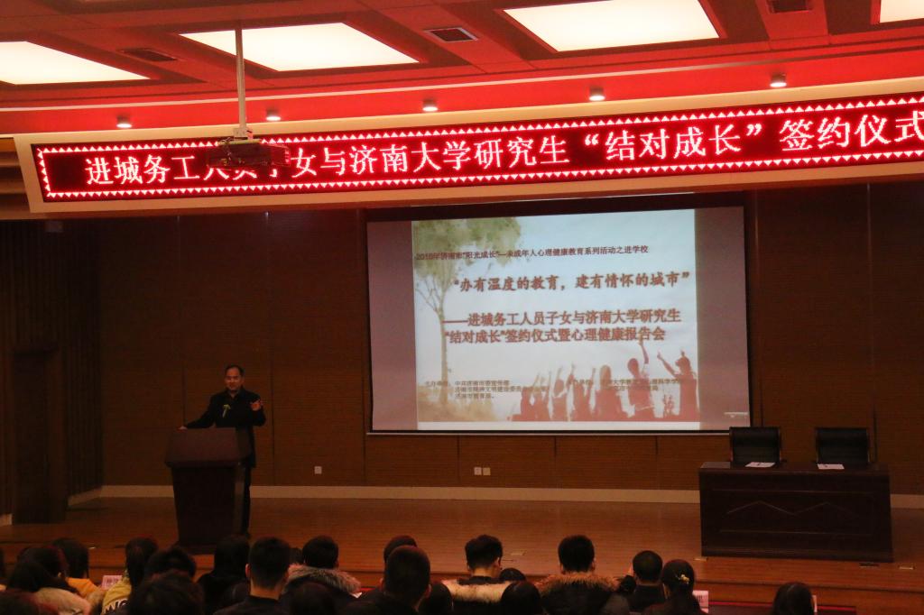 12月3日下午,由中共济南市委宣传部、济南市精神文明建设委员会办公室与济南市教育局联合主办,由济南大学教育与心理科学学院和市中区教育局联合承办的2018年济南市“阳光成长”——未成年人心理健康教育系列活动进学校之“办有温度的教育,建有情怀的城市”——进城务工人员子女与济南大学研究生“结对成长”签约仪式暨心理健康报告会在市中区七贤中学报告厅举行。济南大学教育与心理科学学院副院长王本法教授、教育硕士教育中心主任张素玲教授、副主任魏淑华博士、数学科学学院党委书记韩振来教授以及其他老师和40余名研究生、七贤中学全体教师、七贤中学对口小学教师代表共计200余人参加了此次活动。