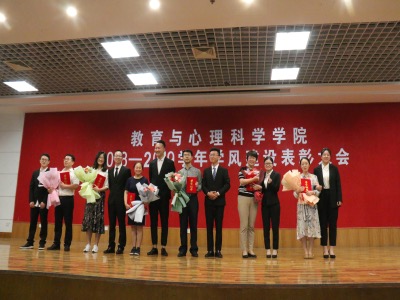 为了表彰先进,激励优秀生,带动潜力生,在全院内形成学习先优、赶超先优、争当先优的良好氛围,持续优化学风、院风,5月16日下午,教育与心理科学学院在第二学术报告厅召开2018-2019学年度学风建设表彰大会。学院党委书记王希普,院长杨昭宁,副院长张婷及学院教师代表、学生代表以及全体获奖人员出席本次大会。表彰大会由党委副书记、副院长季竹君主持。
