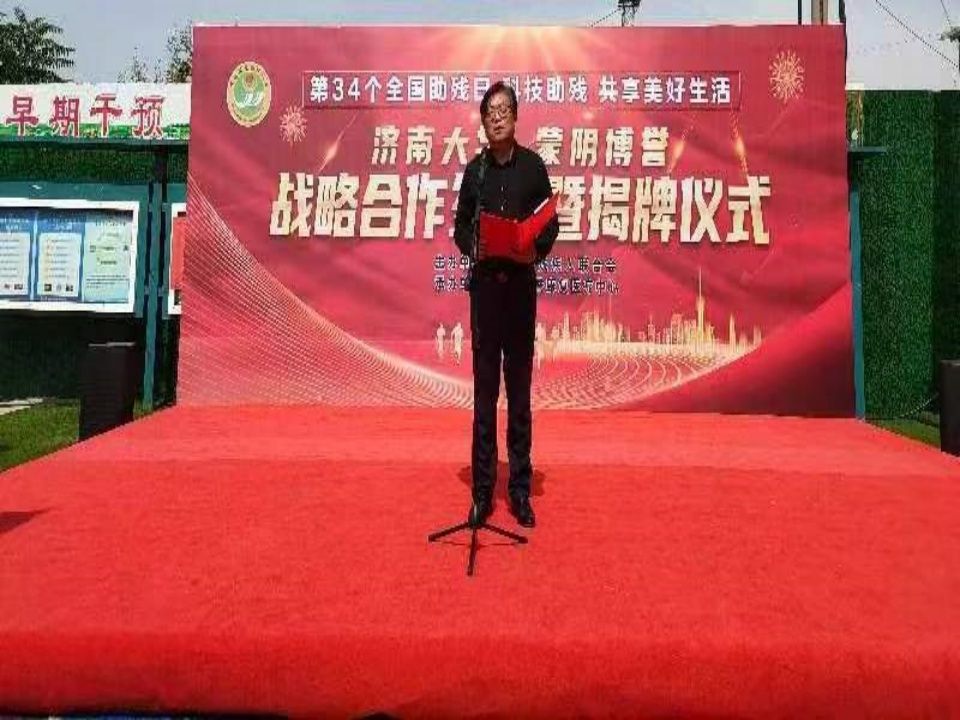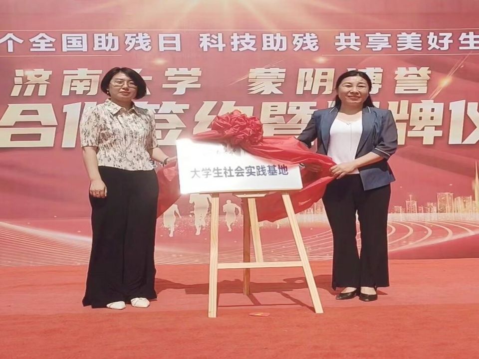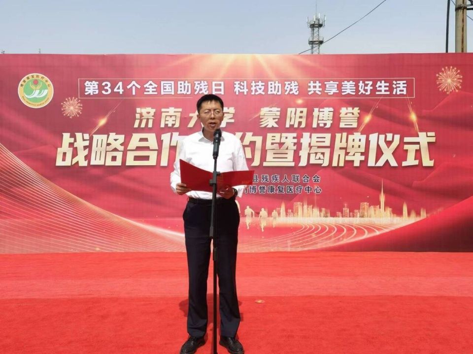 5月17日,在全国第34个助残日来临之际,济南大学教育与心理科学学院与蒙阴博誉康复医疗中心举行战略合作协议签约和“青年就业创业见习基地”及“大学生社会实践基地”揭牌仪式。蒙阴县委副书记、县长苗运全,县人大常委会副主任宋海荣,教育与心理科学学院党委书记季竹君、副院长李开云、学办主任卓华丽、研究生代表,蒙阴县残联、妇联、总工会、县委人才发展服务中心、县科技局、县人才工作集团、团县委、街道办事处等相关部门人员共同参加了揭牌仪式。本次活动由蒙阴县委组织部副部长、县编办主任、县公务员局局长侯进新同志主持。