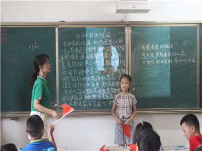 我们首先带领孩子们听歌曲《我爱我的祖国》,一词一句的教给孩子们,孩子们学习能力都很强,很快就能跟着唱起来,顿时教室里歌声嘹亮,心中满满的爱国情。在顺利的合唱之后,我们给孩子们播放了影片片段《建军大业》,让他们了解我们的祖国是如何在这个变化万千的世界屹立于世界之颠,感受当下我们国家的强大,开阔他们的眼界,激励他们不断向前,激发他们内心那份对于祖国的爱,培养他们那份爱国情怀。影片教育意义浓厚,孩子们看的也十分的投入。影片之后我们进行了交流,孩子们纷纷表达了自己的愿望与他们眼中的祖国,争先举手发言,课堂气氛活跃。并且写下了自己的想法。
