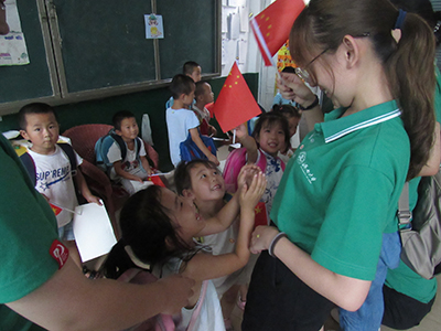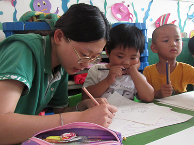 今天要教给小朋友们的是儿童简笔画。当听到本节课的内容时,小朋友们立刻就兴奋起来,叽叽喳喳地议论着将要教授的内容。当纸张分配好后,在其余志愿者为小朋友削铅笔的同时,主讲的志愿者在黑板上画了一面大大的五星红旗,“五星红旗是我们的国旗,是一件很重要的东西,老师现在教你们怎么画,大家都认真学好不好?”小朋友们虽然还不清楚国家的概念,但看到志愿者严肃的神情,听到国旗这个似乎很庄严的词语,小朋友们也安静下来,一笔一划地跟着志愿者学起来国旗的画法。窗外操场的国旗在阳光下愈发鲜艳,小朋友们笔下的国旗相比起来虽显得稚嫩,却也表达着他们懵懂的对国旗的敬意。教室一时只剩彩铅在纸上描画的沙沙声,每一位小朋友的内心,此时都应有一面迎风飞扬的五星红旗。
