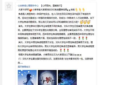 利用学院专业优势,心动泉城心理服务中心志愿者制作出一系列心理测量量表,其中包括焦虑、抑郁、安全感与孤独感等一系列的自测量表,并于3月27日公开收集信息,免费供大学生进行自我测试。我院学生高度关注自身的心理健康情况,积极参与测试,同时期待着测量结果的推送。经过志愿者们一周的数据收集和精确分析,4月2日上午,心动泉城心理服务中心QQ推送号公布了SAS焦虑量表结果,揭示了当代大学生面临的焦虑问题,分享了焦虑方面的相关专业知识。同时也提出了缓解压力的方法与建议,以帮助当代大学生更好地了解和调节自身心理状态。