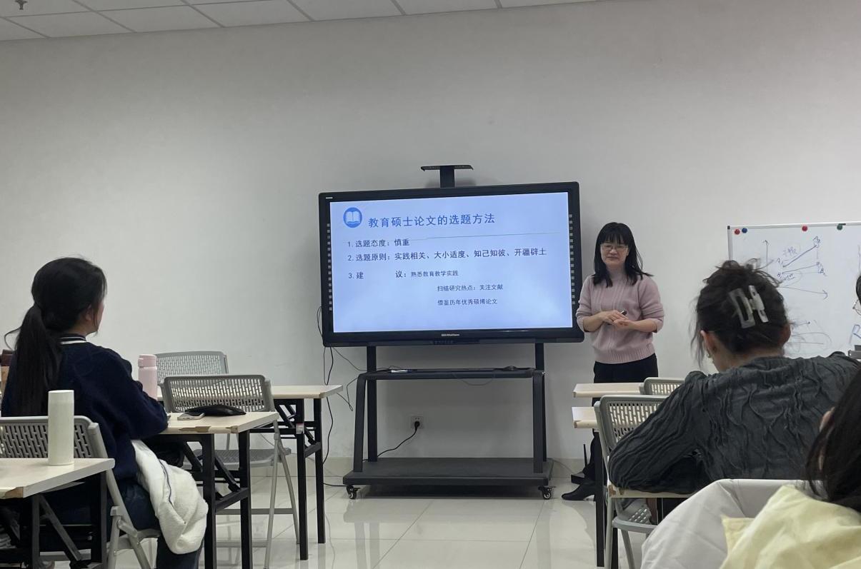 张素玲教授首先带领同学们明确了论文完成过程的具体步骤,帮助同学们在整体上把握论文完成的流程。其次张素玲教授以“做论文如烹小鲜”为切入点介绍了完成论文时应注意的四个方面:提前规划、制定计划、准备资料、不断尝试。张素玲教授从教育硕士学位论文的基本内涵、选题要求、四种形式、选题方法等方面详细的介绍了应该如何完成一篇优秀的教育硕士学位论文。张素玲教授在这一过程中特别强调了教育硕士论文应该区分于学术性学位论文,其更应该注重研究学校教育教学的实践问题。此次论坛让同学们深刻地了解到教育硕士专业学位论文的知识,帮助同学们更好地完成一篇教育硕士专业学位论文。同时,此次讲座活跃了我院学术氛围,促使我院在教育学研究领域取得更加优异的成果,有利于我院学术之路的长远发展。